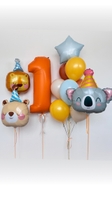 Фольгована цифра (102 см): гігантська цифра преміум-якості (виробництво Італія) у стильному помаранчевому кольорі.3 великі фольговані фігури: чарівні левеня, ведмедик та коала у святкових ковпачках.
