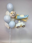 Ніжна та мрійлива композиція в пастельних тонах, яка ідеально підійде для привітання маленького іменинника. Поєднання небесно-блакитних відтінків із кумедним транспортом створить атмосферу справжньої подорожі.