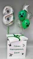 Зробіть день народження справжньою ігровою подією! Цей масштабний набір у стилі Minecraft створений для юних геймерів, які обожнюють пригоди.До складу набору входить:Велика коробка-сюрприз (70х70 см): білого кольору, прикрашена тематичними наліпками, індивідуальним написом та атласним бантом.Фольгована цифра (80 см): сріблястого кольору (номер можна змінити).Стильний фонтан із кульок:- 3 латексні кульки зеленого кольору з принтом «Кріпер»;